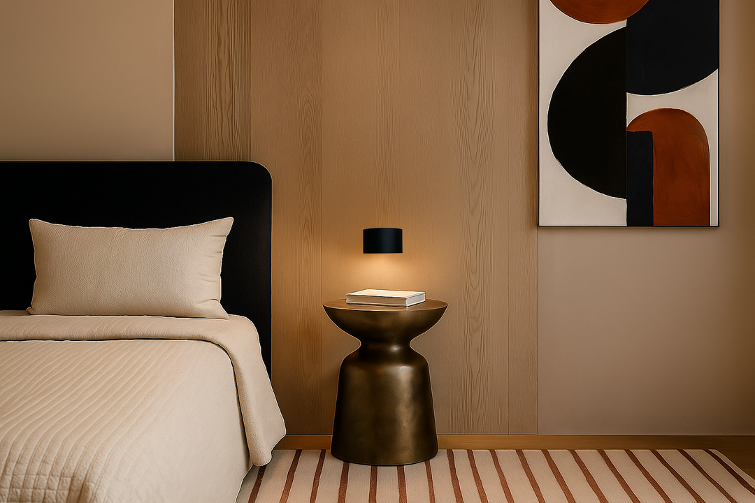 A MAISON MUH lamp next to the bed offers the perfect soft light for evening reading or winding down after a long day. No harsh glare, no tangled cords, just a warm glow.